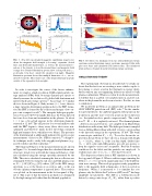 FIG. 3. (Top left) An idealized magnetic equilibrium (rigid rotor) shows the magnetic field strength (color map), separatrix (dotted line), and field null (dashed line), as well as the measurement lo- cations of the density (colored horizontal lines) and magnetic field (orange dot). Density fluctuation spectra show a clear peak near ωci at all radii, even those outside the separtrix (top right). Magnetic fluctuation spectrum shows that multiple harmonics of ωci are ex- cited (bottom left). The relative size of the density fluctuations peaks outside of the separatrix (bottom right).